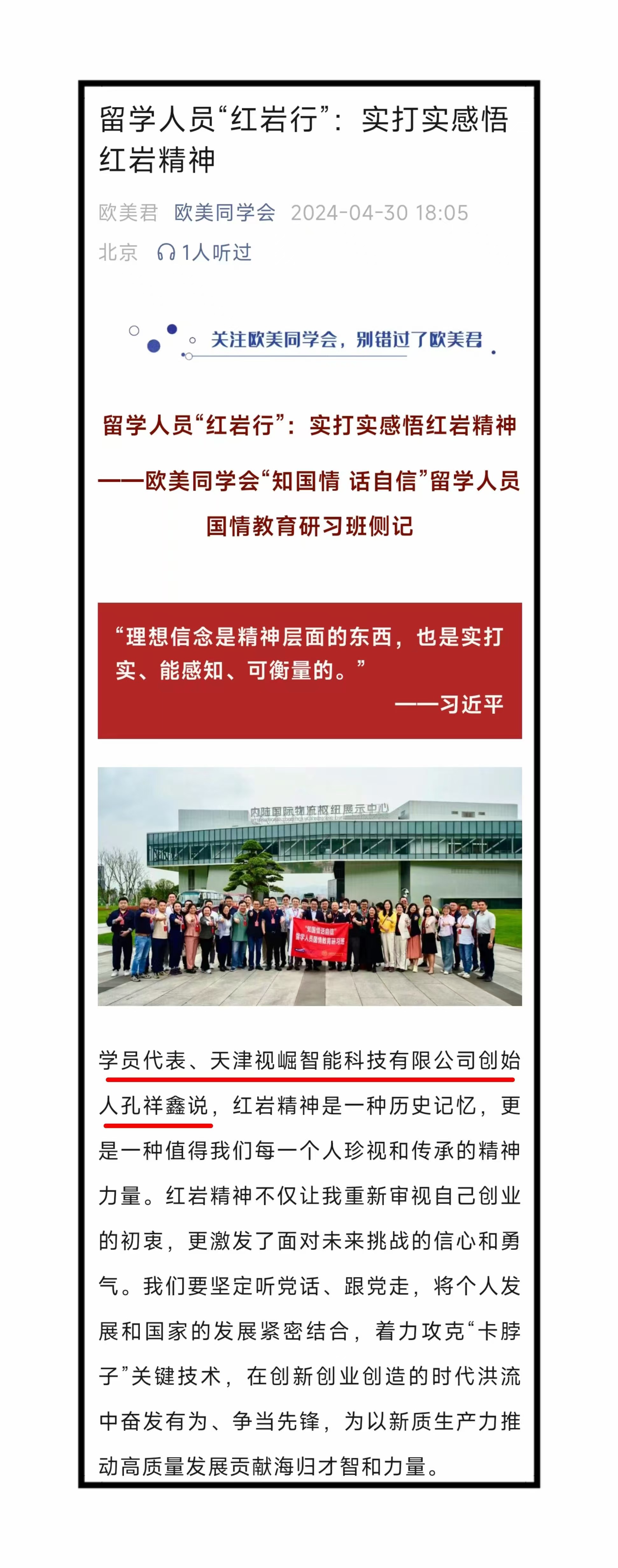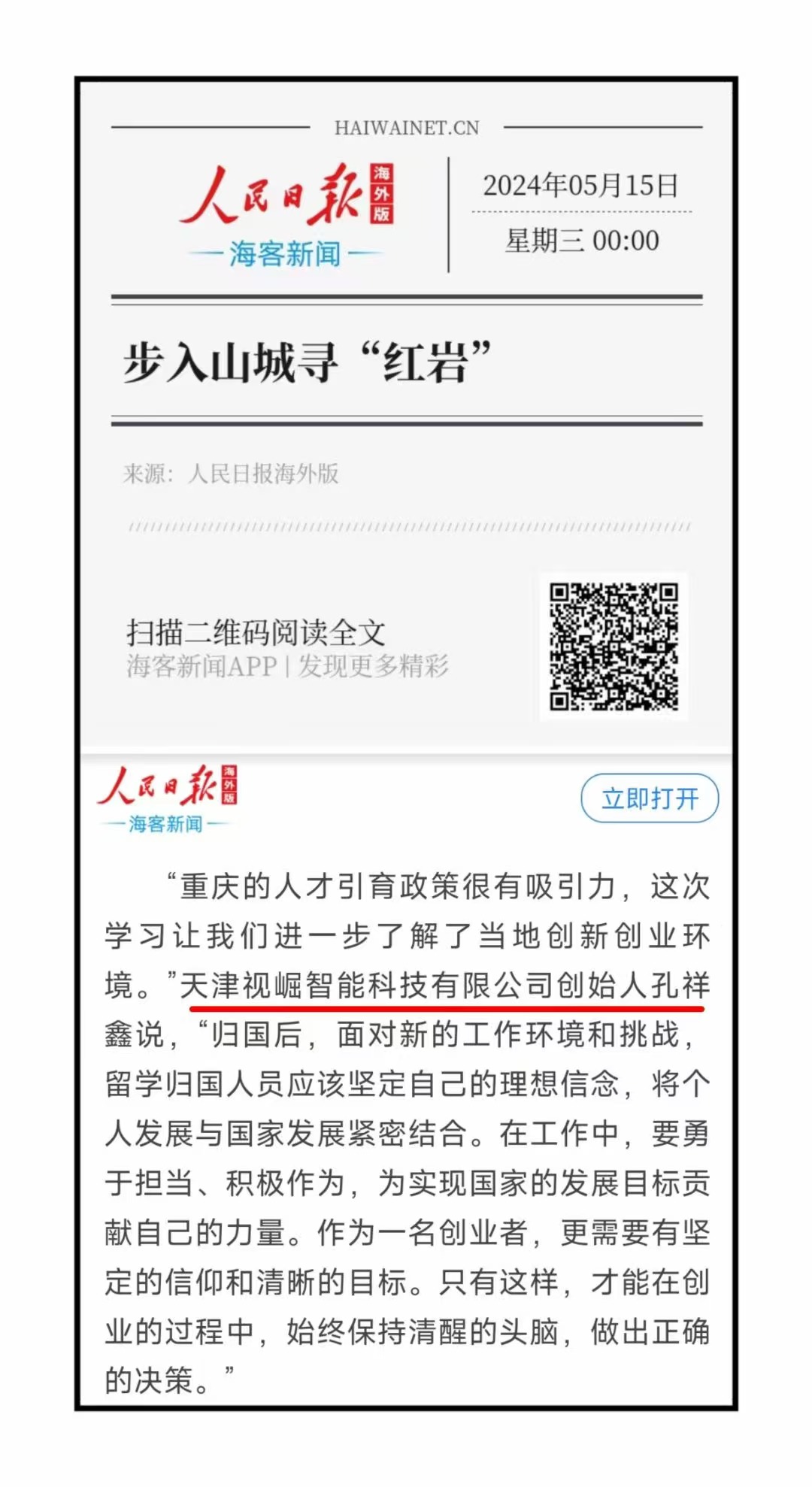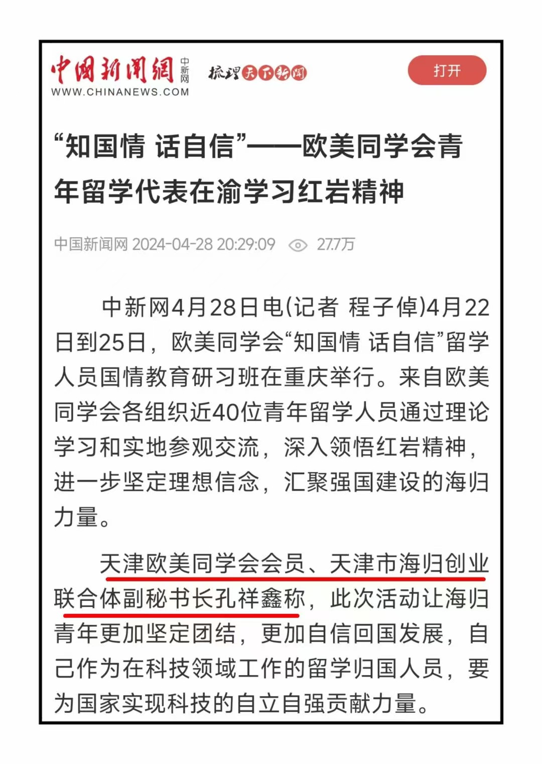 2024年5月15日,有幸作为欧美同学会青年留学代表,被《人民日报》海外版、《中国新闻网》、《留学生》杂志等媒体采访并刊发报道。